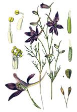 Едногодишно тревисто растение с високо до 1 м разклонено стъбло. Листата са дребни, длановидни, линейно нарязани. Цветовете са синьовиолетови, понякога розови или бели, събрани в метловидни съцветия. Чашката е петлистна с петлистно венче с една, рядко с две шпори, и с многобройни тичинки. Плодът е мехунка с чернокафяви семена. Цъфти м. юни - август.
