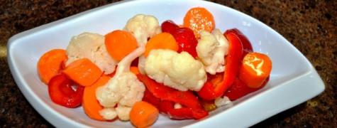 Маринована мешана туршия Прoдукти: 3,5 кг чорбаджийски чушки, 500 г зелени домати, 1 кг моркови, 1 кг зеле, 100 г чесън, 300 г целина листа, 500 г олио, 1,6л оцет, 300 г сол, 300 г захар, черен пипер, бахар, 3 дафинови листа Нaчин на приготвяне: Нарязваме морковите на ...